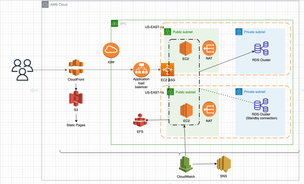 CloudFront, S3, EC2, EFS, RDS, CloudWatch