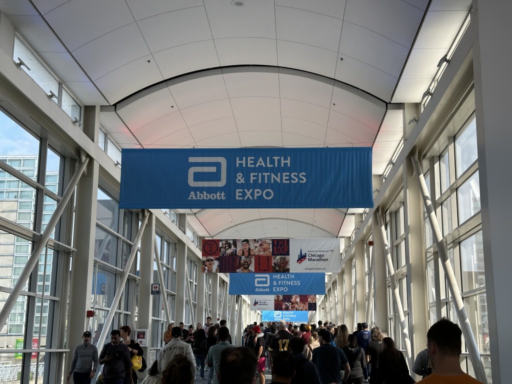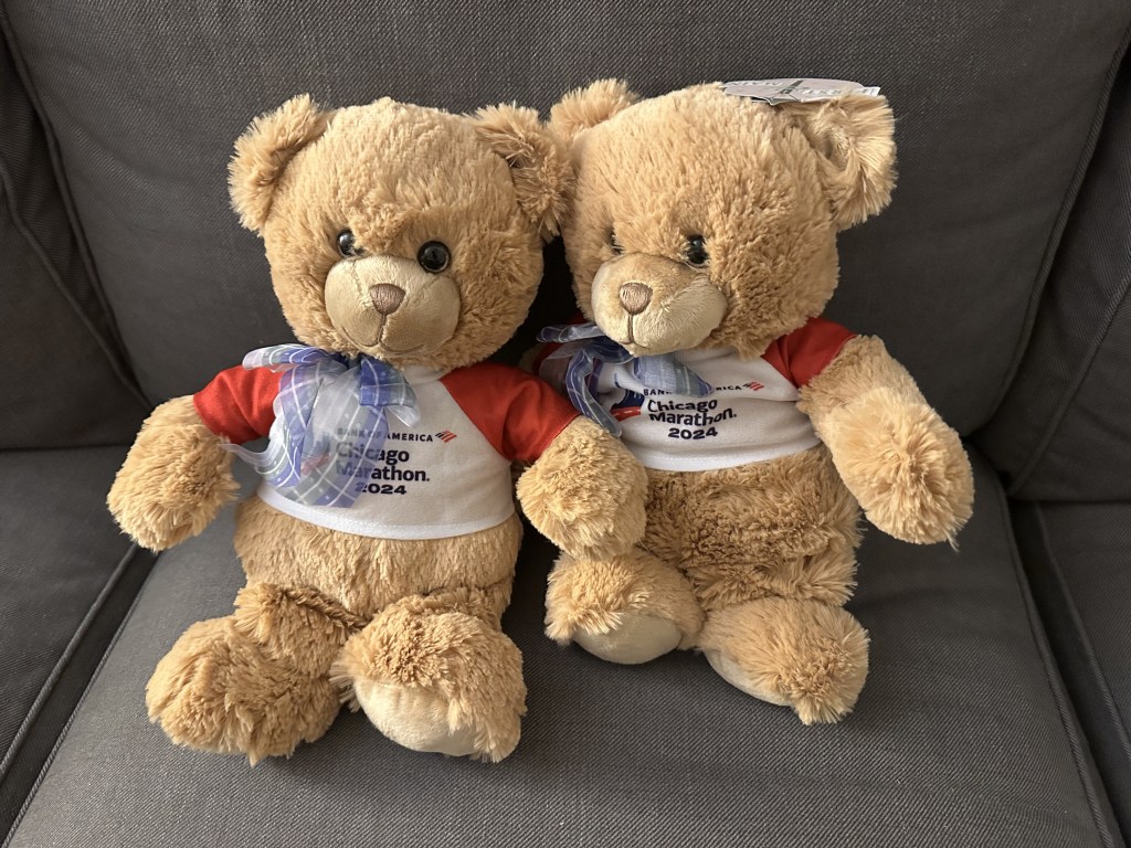 地铁+公交来到了Expo跟YJ碰面拿号码牌。来芝加哥想买的期中一件纪念品是马拉松小熊,出发前犹豫要不要在网上提前订,提前订需要捆绑购买一个环保袋,但是我并不喜欢那个环保袋,于是决定现场买。但是YJ告诉我他在跑步群里看到有人说小熊卖完了,我很震惊,这也能卖完??不信邪的我还打电话问了店里,说确实全部卖完了,但是第二天在终点附近的4间pop up商店还会有一些货。顿时压力倍增,这得快点跑啊,要不然熊又卖完了。同时打开了终点地图,挑了一家最偏的商店,跑完之后直奔商店。